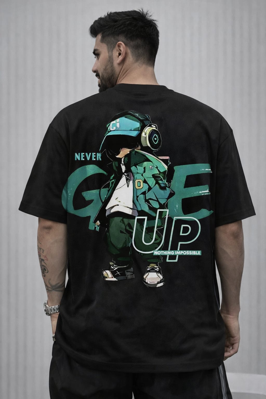 Made from premium quality cotton fabric, this oversized t shirt offers a soft feel and breathable comfort for all day wear. The drop shoulder construction enhances the loose fit silhouette, giving it a contemporary and laid back vibe. The large back print showcases a detailed character design with “Never Give Up” text, creating a strong street inspired look that makes an impact from every angle.