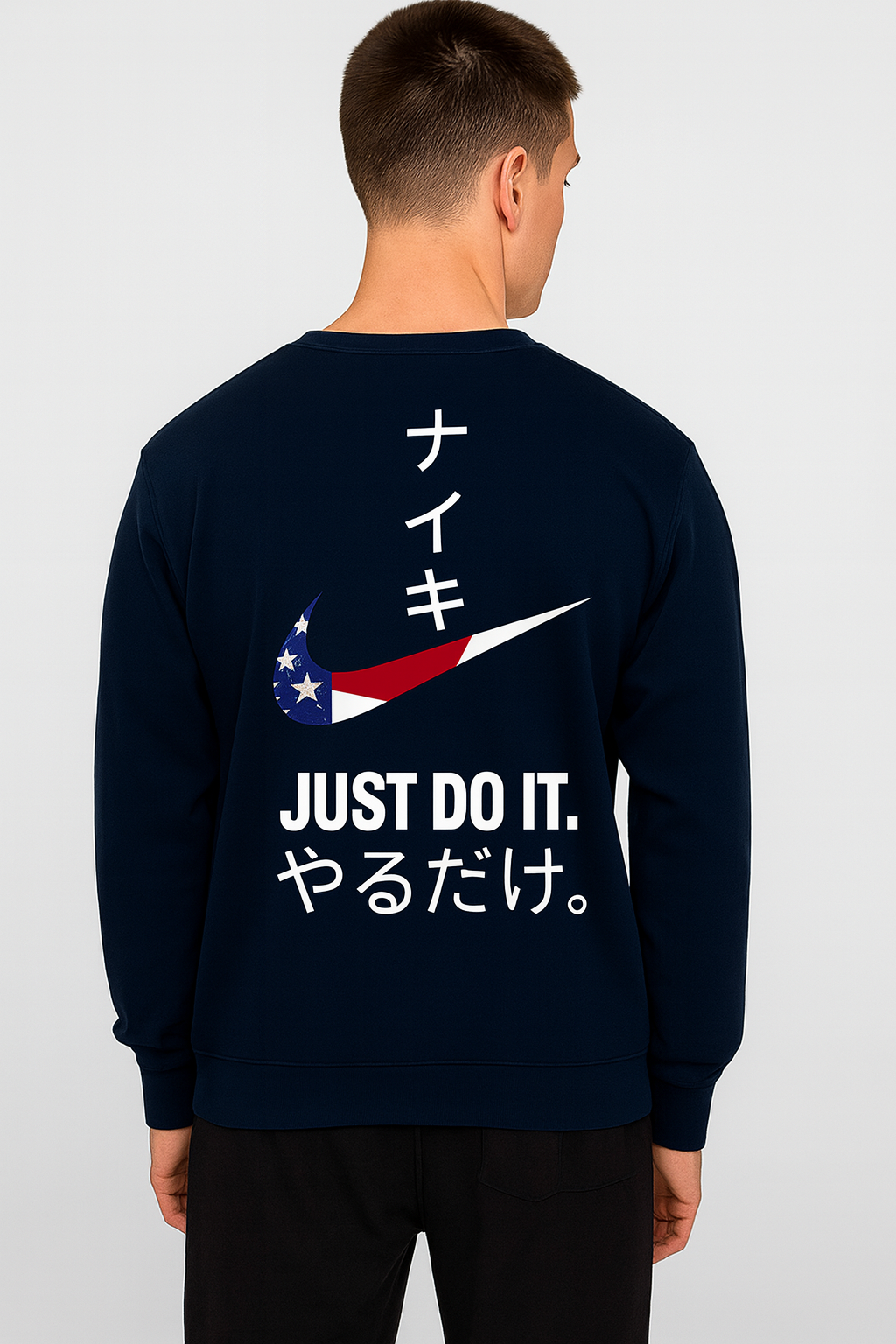 Step up your streetwear game with this Navy Graphic Swoosh Sweatshirt, designed for those who like bold, statement-making back prints. The sweatshirt features a striking swoosh-style graphic with a modern artistic twist, paired with motivational text in both English and Japanese for a unique global vibe.