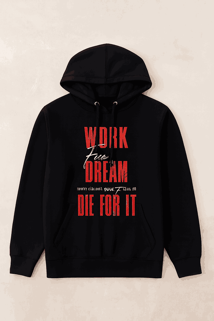 Turn ambition into style. This bold black hoodie features the powerful message “WORK THE DREAM – DON’T SLEEP ON IT – DIE FOR IT” in striking red and white typography. Designed for dreamers, hustlers, and go‑getters, it’s more than apparel — it’s a mindset.